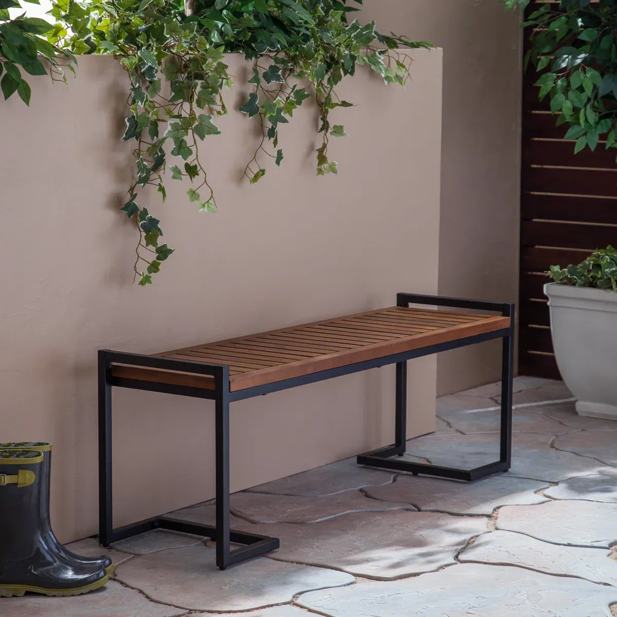 This modern bench blends clean, industrial lines with the natural warmth of wood, making it a perfect addition to any space, indoors or out. The minimalist design features a sturdy black iron frame and a slatted wood seat. It’s an ideal seating solution for your garden, patio, entryway, or mudroom, offering a durable and stylish accent.