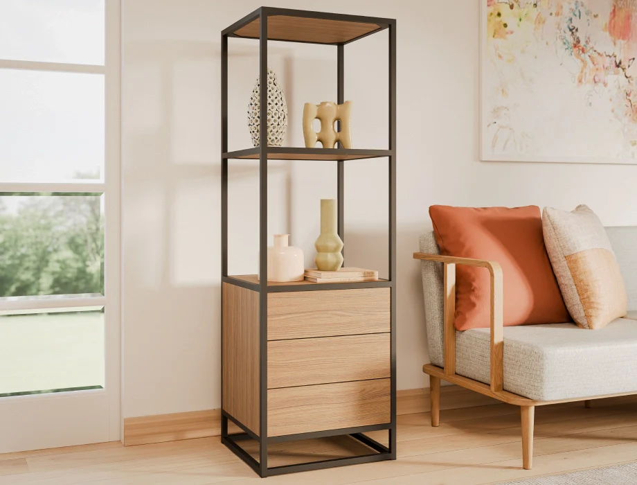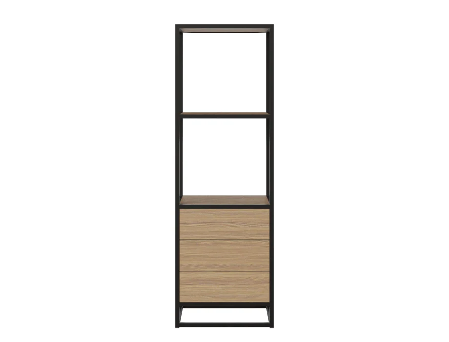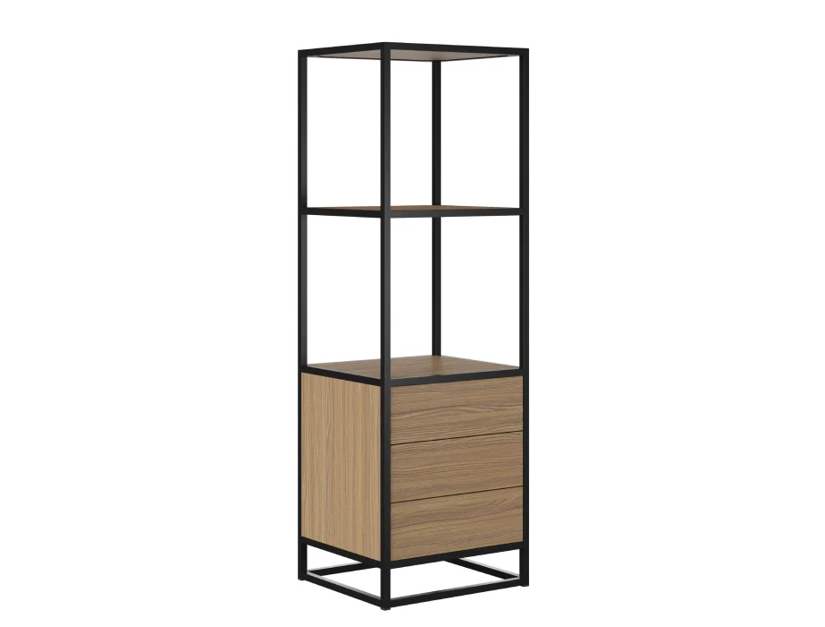 The Arbour Etagere Shelf is a highly functional and stylish piece of furniture designed to optimize storage in a compact footprint. The unit’s top section consists of two open shelves, perfect for showcasing books, vases, or other decorative items. Below, the three handle-free drawers offer a clean look and are equipped with a push-to-open mechanism for easy access to concealed storage. Constructed with a durable metal frame and wood-finished panels, the shelf is both stable and resilient. It also features rubber-capped legs to protect floors from scratches and ensure stability on any surface, making it an ideal addition to a living room, bedroom, or office.